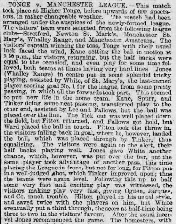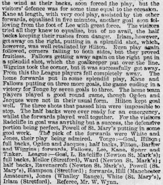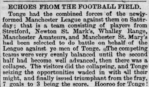 • The article also mentions that a league representative side will be formed in April to play against some of the clubs also in the league. One of the games was against Tonge. The Middleton Guardian had extensive reports from the game that took place on Saturday 12 April 1890: