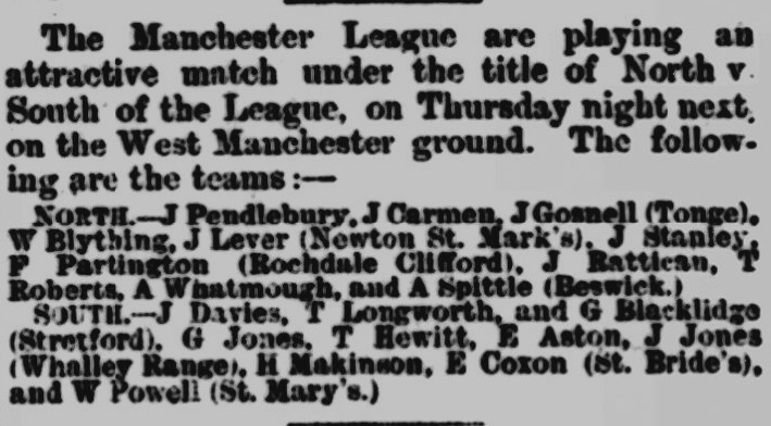 • There was a pre-season North v South match played on Thu 3 Sept 1891, as reported in the Athletic News. With now 5 of the 11 clubs classed as "North" - interestingly Ardwick Reserves and Dalton Hall didn't get anyone selected for the South team