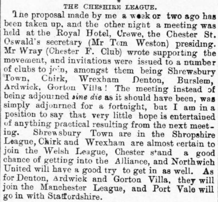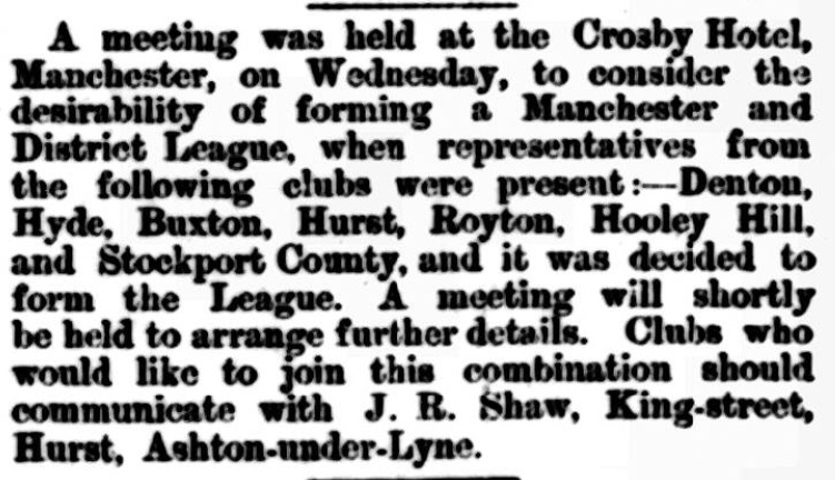 • Nothing further was heard of this league, and so it can be assumed to have failed to materialise. Stockport County and Buxton joined the Combination in 1891 - Denton were already in it and continued in it 1891/2 and so clearly the plans fell apart and it doesn't appear that this new league actually launched under a different name
