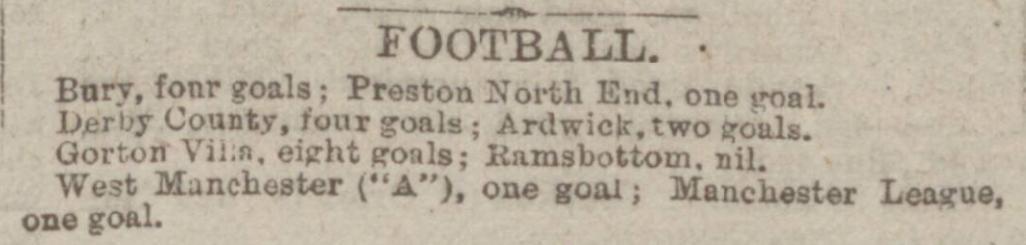 • The Manchester League then gets a mention in a Welsh newspaper, the Rhyl Record & Advertiser, talking about a proposed Cheshire League, and how they doubted it would launch (which it did a few weeks later as the Cheshire Junior League). They mentioned that it wouldn’t launch because proposed clubs were already joining other leagues, stating that Denton, Ardwick and Gorton Villa "will join the Manchester League” – which they didn’t. Denton and Gorton Villa joined another new league for 1890, “The Combination”. Ardwick, though they didn't join the Manchester League, their Reserves did in the 2nd season. This is the Rhyl Record & Advertiser story from Saturday 22 March 1890: