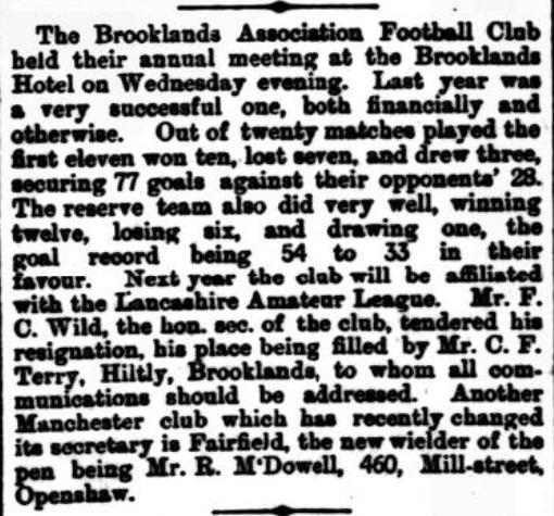 • Brooklands publicly announced at their AGM on 21 June 1893 that they were joining the new league, now named as the Lancashire Amateur League