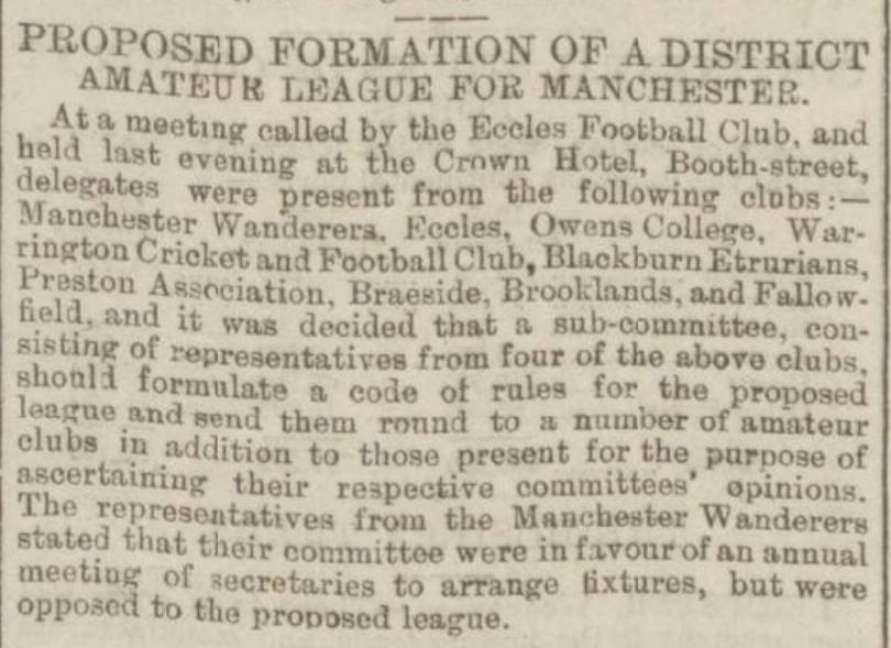 • Manchester Wanderers made it quite clear in the meeting notes, that while they agreed with an annual meeting of club secretaries to arrange fixtures, they were opposed to the formation of the new league - though they did end up joining a different league instead - the Manchester Alliance, which had formed the previous season