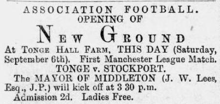 • The first games of the season took place on 6 September 1890. Tonge played Stockport at their new ground. Having previously played in a field in Upper Tonge, they were moving to within view of the prestigious Tonge Hall, on the ground at Tonge Hall Farm, which was called the Old Brick Ground. The Mayor of Middleton was also the club president, and was doing the kick off – hopefully only ceremonially. The Mayor was J W Lees of brewery-fame, as they were and still are based in Middleton. Interesting that ladies were allowed free entrance. The front page of the Middleton Guardian on the day saw this advert: