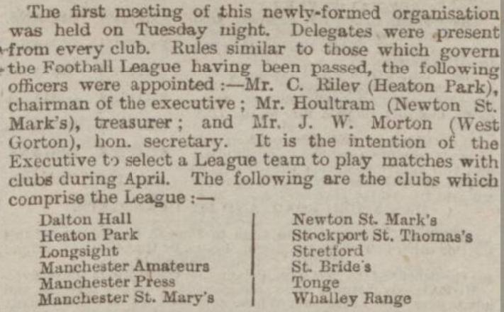 • The league was then officially formed at a meeting of the clubs on 1 April 1890. Twelve teams were initially announced as joining the league, as per the Manchester Evening News on Thursday 3 April (three more joined later). However Stockport St Thomas's was renamed as Stockport in time for the 1890-91 season. However 4 of the teams withdrew before the season started - Heaton Park, Manchester Amateurs, Manchester St Mary's and Worsley: